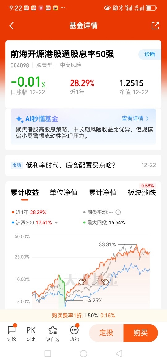 港股红利今年以来持续稳健上扬。众所周知,红利板块向来表现稳定,虽然很少暴涨,但奈何波动小,稳定性高。赚少总比亏多好,这次降息放水资金就是往顺周期板块进的,而且现在市场不断波动,红利板块后面还是有很大空间的。而$前海开源港股通股息率50强$ 近一年来涨幅接近30个点,表现也是非常出色的了!可以作为资产配置的一部分,积极参与。