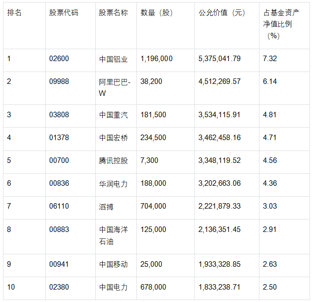 第一,行业分布相对分散。虽然前十大重仓股中包含了有色金属(中国铝业、中国宏桥)、互联网(阿里巴巴、腾讯)、电力(华润电力、中国电力)等多个行业,但单一行业占比不高,有效分散了行业风险。