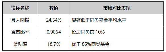 此外,该风控体系密切跟踪汇率波动与政策变化等宏观变量,将其作为风险预警和调整的重要依据。这套动态风控机制的有效性在实践中得到了验证。基金在市场调整期间表现稳健,如在2024年三季度市场回调时最大回撤仅为15.57%,显著低于沪深300指数。其近三年波动率控制在18.7%,夏普比率达到0.9064(同类前10%),各项风险调整后收益指标均优于市场多数同类产品,证明该机制在控制下行风险和提升投资效率方面发挥了重要作用。