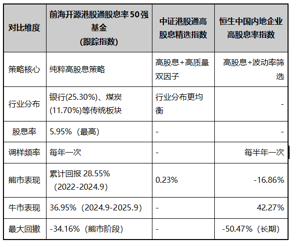 在港股红利产品矩阵中,前海开源港股通股息率50强基金的收益风险特征呈现出鲜明的差异化定位。其跟踪标的中证港股通高股息投资指数在熊市阶段(2022.1.1-2024.9.23)展现出较强的防御性,累计回报达28.55%,最大回撤为-34.16%,表现显著优于同期高股息精选指数(0.23%)和恒生高股息指数(-16.86%)。这表明该基金所代表的纯粹高股息策略在市场下行周期中具备更优的抗跌能力。然而,在近一年的牛市行情中(2024.9.24-2025.9.30),该指数回报为36.95%,虽保持稳健增长,但低于恒生中国内地企业高股息率指数同期的42.27%,反映出其在市场快速上涨阶段弹性相对有限的特征。