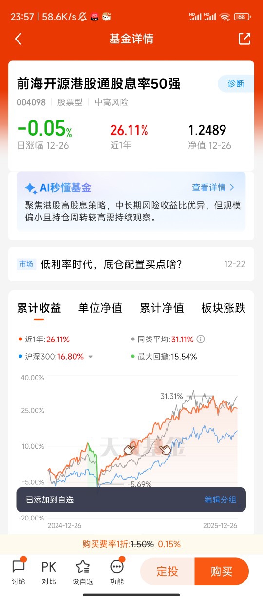 前海开源港股通股息率50强(004098)是聚焦港股高分红赛道的股票型基金,核心精选港股通标的中50只高现金分红个股,持仓以金融、能源、公用事业等现金流稳健板块为主,兼具高股息+低估值双重属性,近一年净值涨幅26.11%,长期业绩跑赢同类红利产品,是布局港股红利的优质标的。