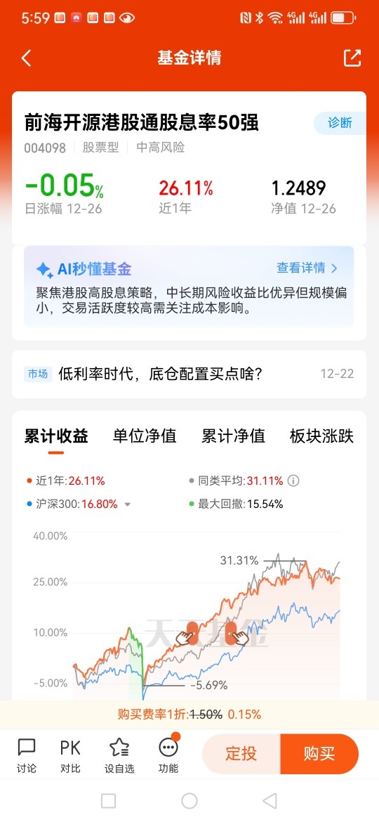 港股市场整体估值较低,更具性价比,潜在上涨空间较大,$前海开源港股通股息率50强$ 主要通过港股通投资内地投资者熟悉的优质公司,分散A股市场单一风险,增强组合韧性。该基金近一年上涨了23%,业绩表现还是相当不错的,它受益于两地市场互联互通机制,流动性较好,且受国内政策鼓励,长期配置价值显著。 并且在市场震荡期表现稳健,防御属性突出,比较适合想要追求稳定又想获得不错收益的投资者!