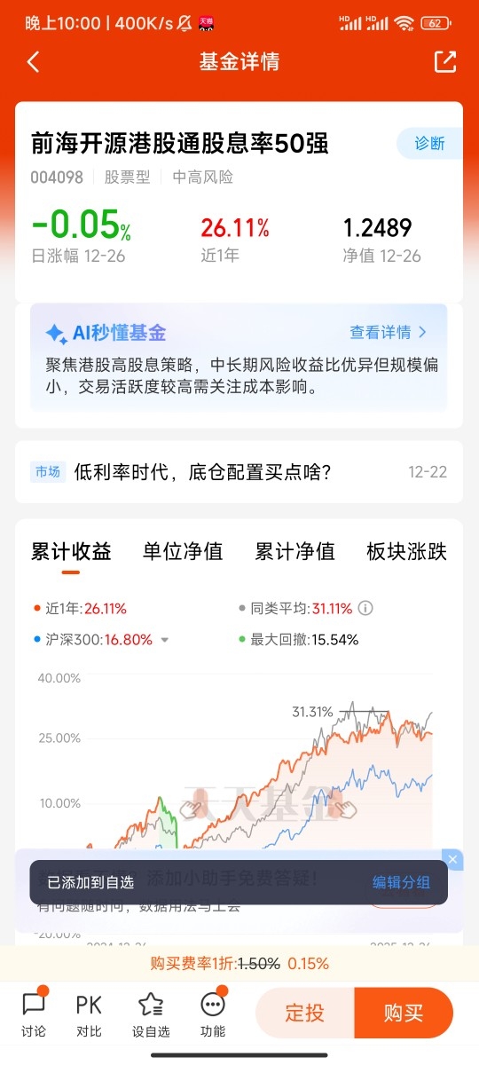 前海开源港股通股息率50强是一只聚焦港股通高分红标的的基金,核心就是挑选港股通里股息率靠前、分红稳定的50家优质公司。从业绩来看,这只基金近12个月涨幅超过26%,近6个月也有11.81%的收益,在震荡市场中展现出了不错的稳健性。