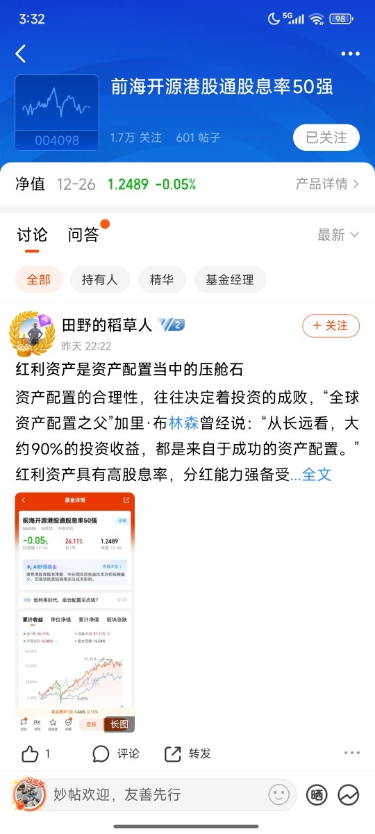 $前海开源港股通股息率50强$ 港股通央企红利指数的成分股大多分布在银行、公用事业、煤炭等行业具有市值大、财务表现优异、现金流充沛、盈利能力稳健等特点。同时高股息率对应的低市盈率,价值特征使得这样的资产具备较强的价值回归空间在市场震荡市表现出更强的防御与进攻能力,提现出长期的配置价值。