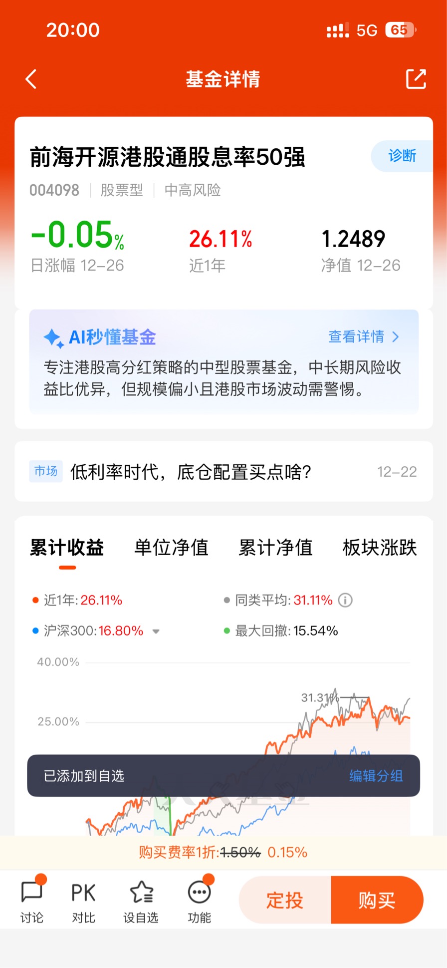 红利低波动指数基金具有高分红,低风险等优势,现在股市风险太大,我们可以为我们的持仓配置一部分的红利基金$前海开源港股通股息率50强$ ,这样我们就可以无惧市场下跌的风险!