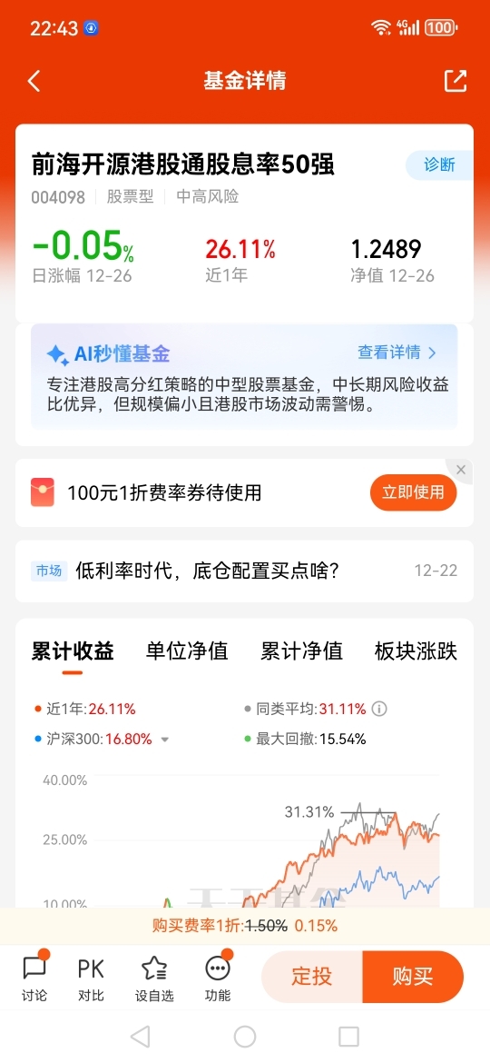 $前海开源港股通股息率50强$ 近一年涨超26.11%,近3年累计收益44.21%(同类前22.1%),最大回撤24.34%(前11.8%),夏普比率0.63(前14.8%),体现穿越周期的超强能力,值得作为为配置稳健配置在我们的投资组合中。