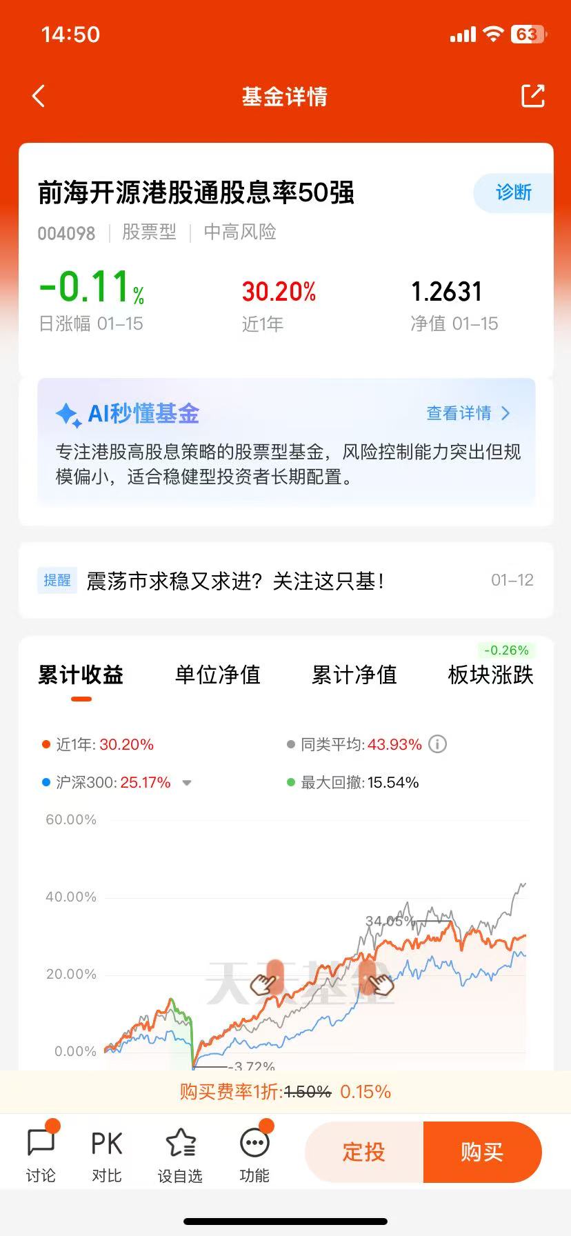 总体而言,前海开源港股通股息率50强基金(004098)凭借港股高股息资产的独特优势、科学的筛选机制和稳健的业绩表现,确实是当前布局红利资产的优质选择。在低利率环境持续、政策红利释放的背景下,该基金能够为投资者提供稳定现金流+抗波动属性,是构建均衡投资组合中不可或缺的"压舱石"资产。@前海开源基金