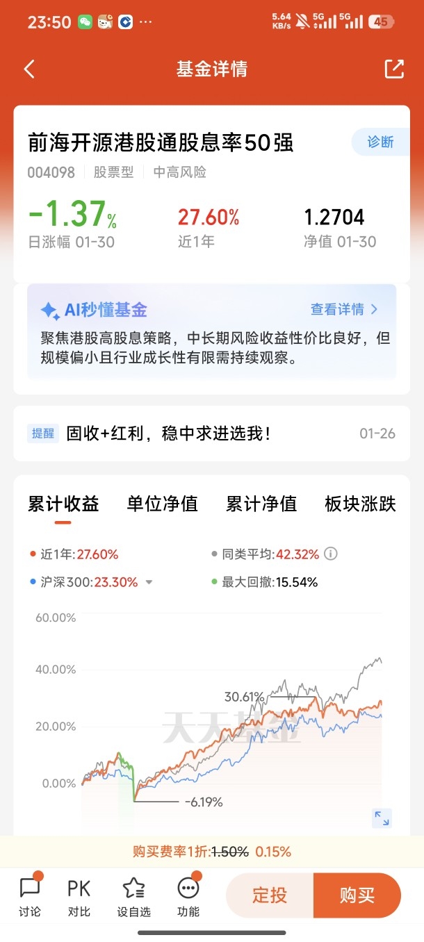 其次,对比直接买港股或者其他类型基金,这只基金帮我们省了不少事。港股开户有门槛,自己选个股也得花大量时间研究,还容易踩坑,而这只基金专业团队帮我们选好了优质高股息标的,一键布局50只,分散了风险,不用单吊一只股票担惊受怕。而且它聚焦港股通,港股的高股息标的估值普遍偏低,性价比高,长期拿着有增值的空间,底仓不仅要稳,也得有一定的收益潜力,这一点它刚好满足。