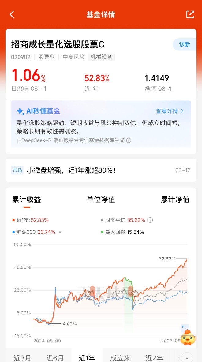 回撤小+收益香的双面手!招商成长量化选股股票C今年累计收益2%,昨今连涨1.06%!近1年52.83%验证实力,3600点行情岂能缺席?