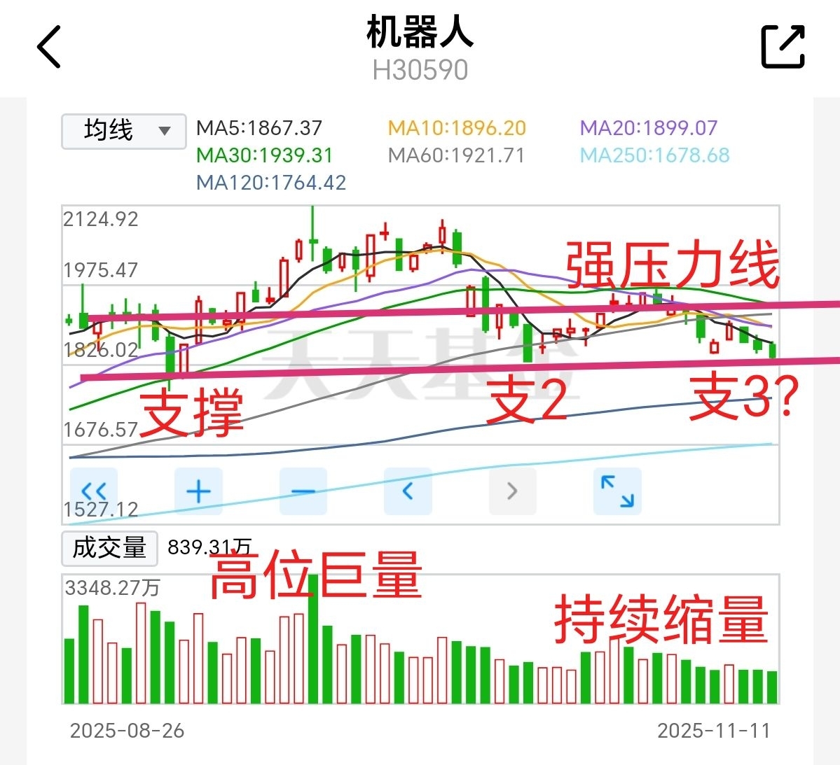 机器人今天把剩下的尾巴也抛了。无他,持续性沿5日均线向下,明显的下跌通道,不抱希望。今天己跌到支撑线,该线己出现一碰就反弹的行情多次。明天是否反弹?理论上,我应该留下尾巴看看明天情况。但想想还是算了,现在大科技板块的k线大多己进入类似的下跌通道。上方还有个强压力线,就算反弹,也很快受压制。这个位置,不是我这种波段型选手的领地,避开是我的选择。什么时候再回来?我不吃鱼头,突破上方强压力线,再考虑。