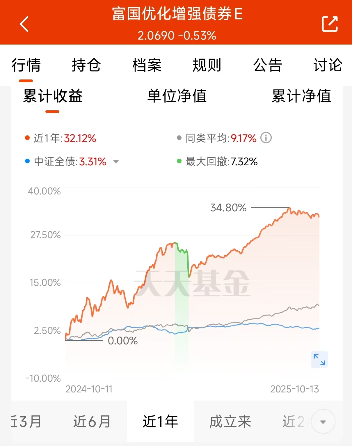 在市场震荡期,固收+产品由于债券仓位的缓冲,波动通常小于股票基金。同时,债券底仓还能提供长期稳健收益。$富国优化增强债券E$(018980)就是不错的选择,近一年收益达32%,最大回撤控制在8%以内,持有体验较为舒适。#OpenAI联手博通!AI产业链怎么投?#