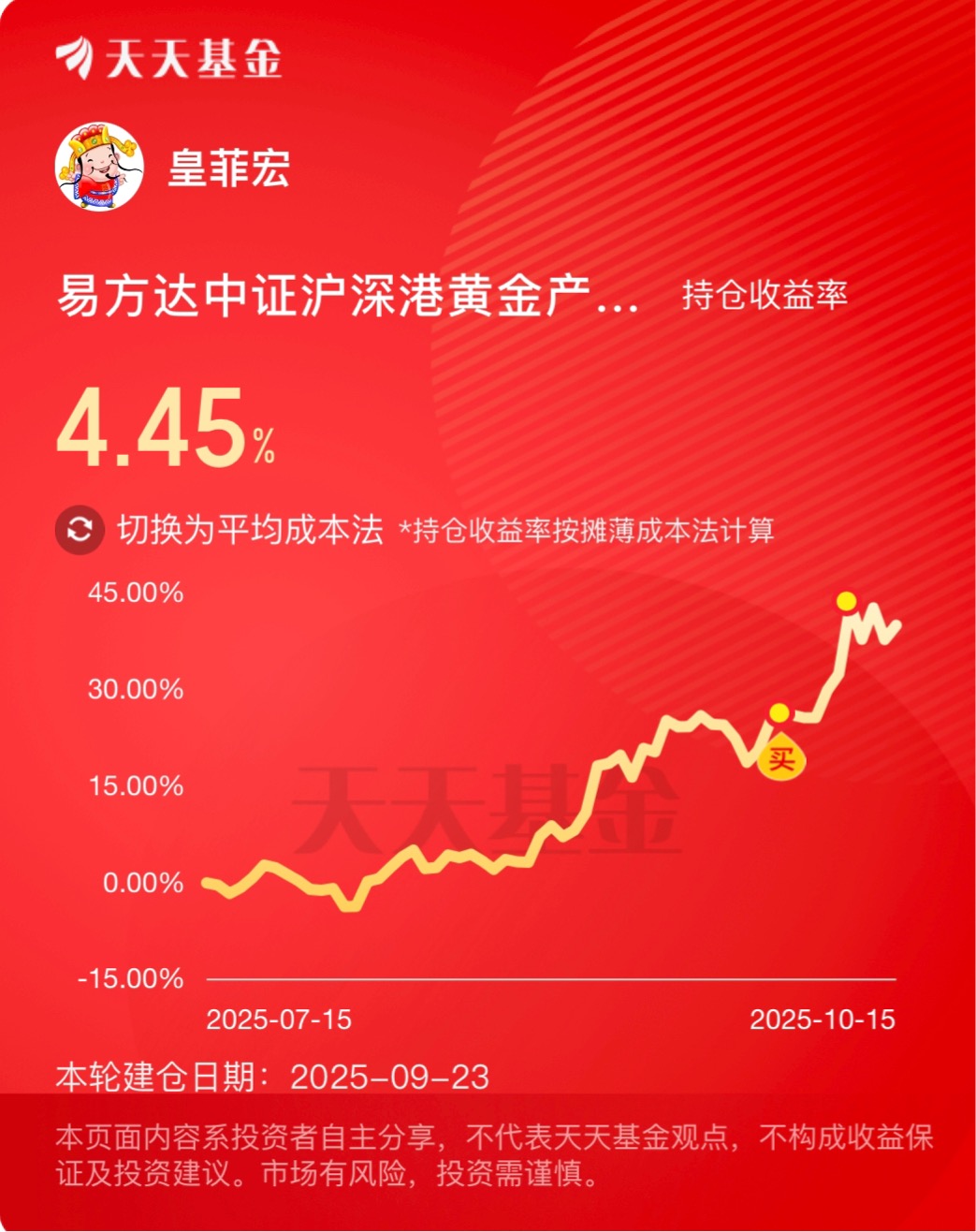 最近市场波动明显,中美在多个领域博弈升级,短期不确定性加大。趁此机会,我关注了$易方达中证沪深港黄金产业股票指数发起式C$ ,其作为黄金资产,独立于股债市场的表现凸显避险价值。