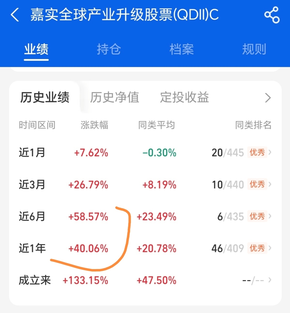 今天股市行情都不错,晚上美股指数全红,还在拉升中,嘉实全球产业升级基金近1年40