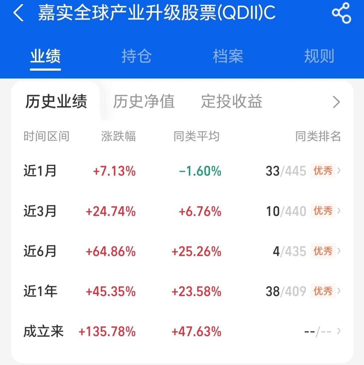 太棒了,行情不错了,三大指数高开高走,连续涨两天,全球市场表现也不错。嘉实全球产业升级股票(QDII)C聚焦三个方向,分别是AI 与数字经济、新能源与可持续发展、高端制造与硬科技,通过三层筛选在全球选优质企业。 它不局限单一市场,布局A股、港股和海外市场,近三月涨24.74%,近六月涨64.86%,近一年收益超45%,作为股票型基金能分享产业升级红利。继续看好。$广发纳斯达克100ETF联接人民币(QDII)C$ 不错,$华宝纳斯达克精选股票发起式(QDII)C$ 可以,$富国全球消费精选混合(QDII)人民币C$ 也不错