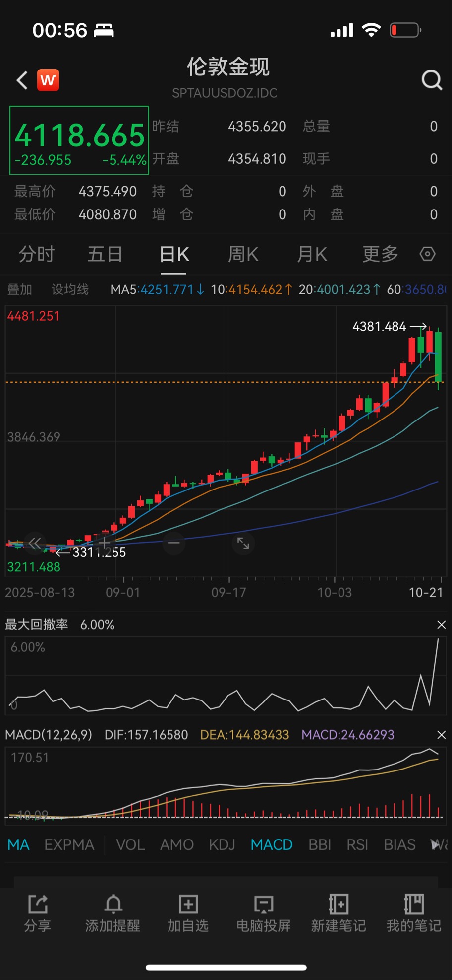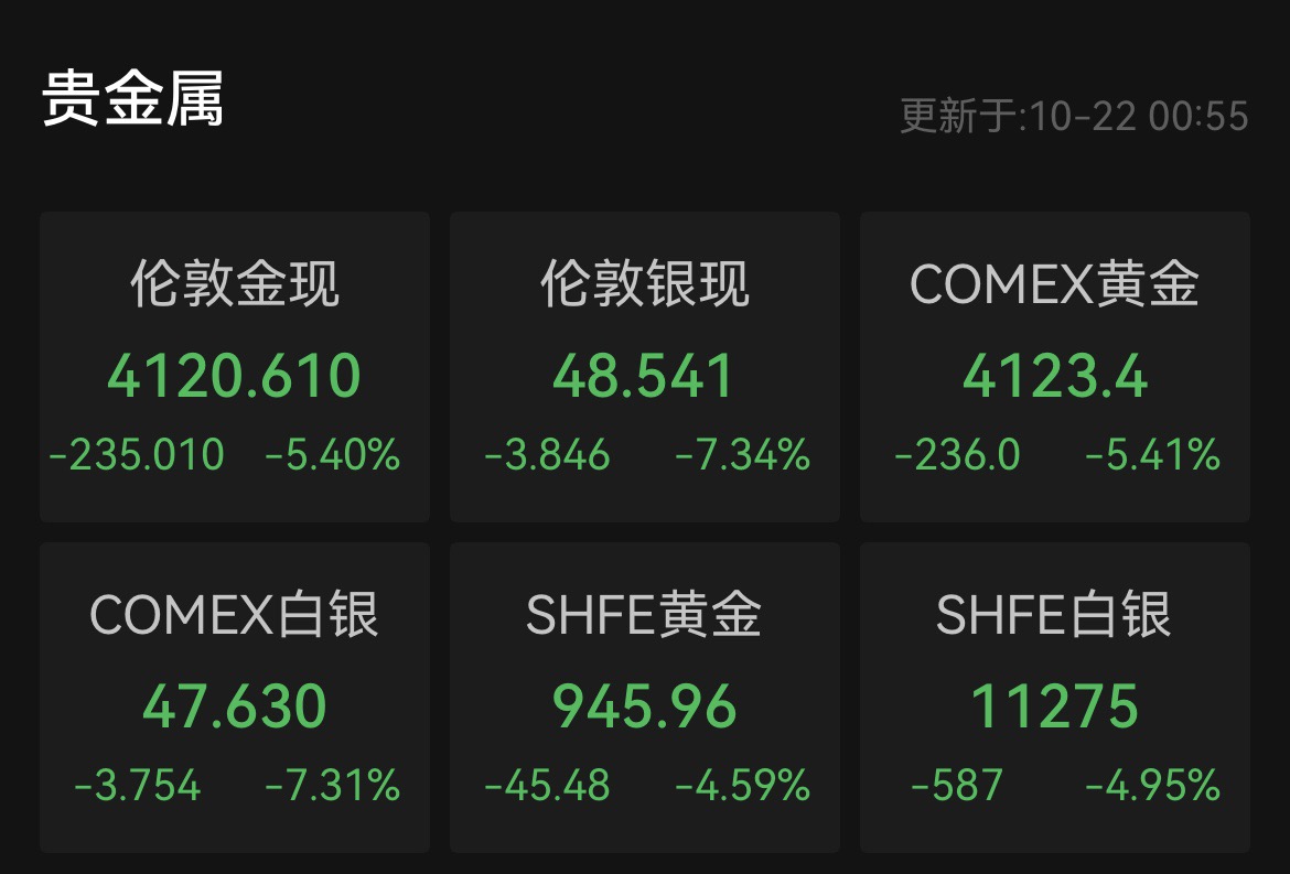 暴跌:然而,在周二(10月21日)晚间,行情急转直下,现货黄金价格单日跌幅超过5%,一度跌破4120美元/盎司。这次暴跌的主要原因是,在金价连续上涨并处于历史高位后,部分投资者选择获利了结。同时,市场传出美国政府停摆危机可能很快解决的消息,略微缓解了避险情绪,加之美元走强,共同触发了价格的快速回调。