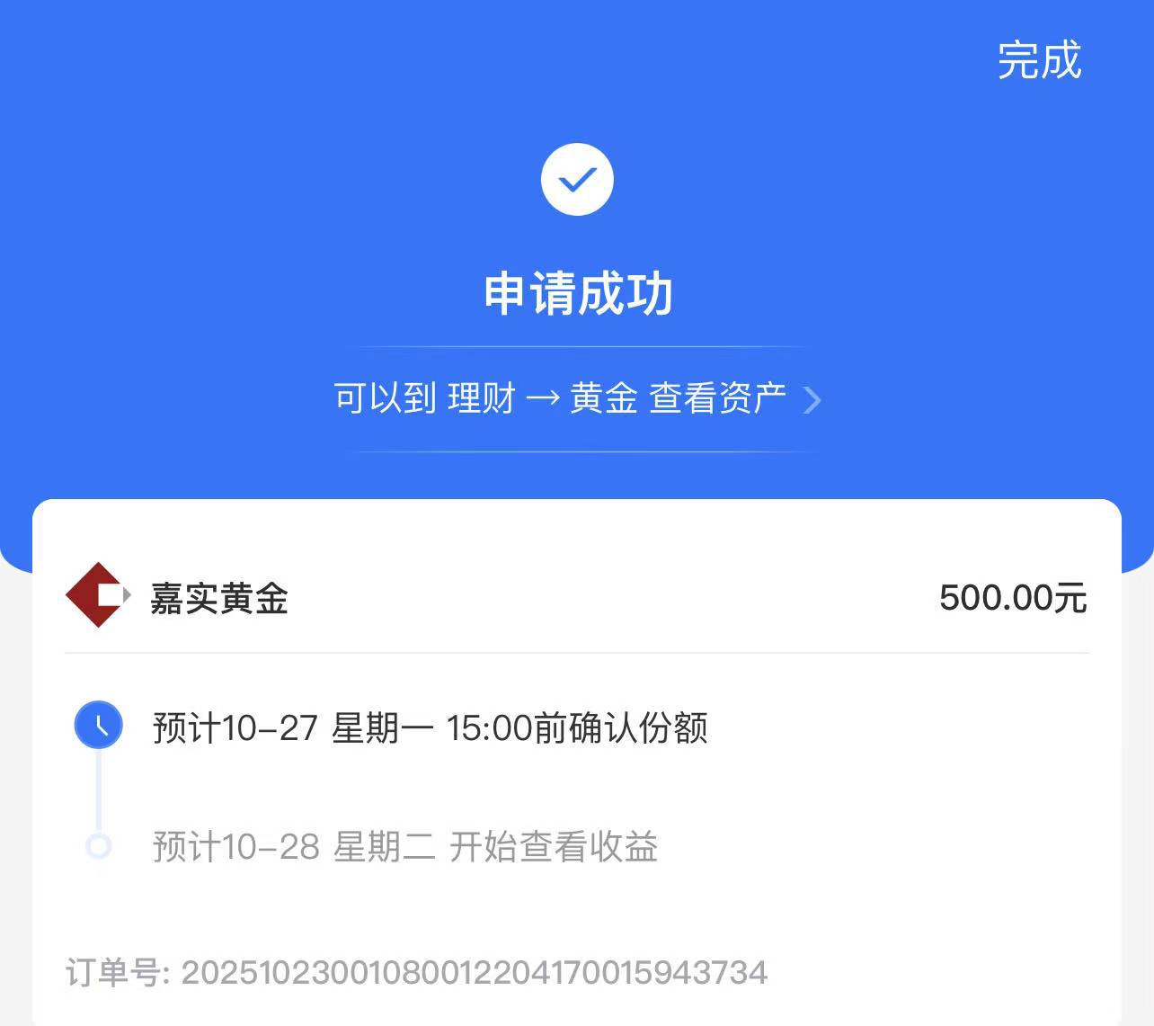 尾盘v起来了,最近黄金倒车接人,不少朋友都在观望,没勇气上车,但是对于我来说,对于后期大黄趋势,还是持续上涨的,之前涨幅大家也是有目共睹,我觉得黄金还是可以的,现在只是短暂回调,现在我打算继续发车,比如我手里准备看好的$嘉实黄金$ 的, 今天继续加一波,期待它后续的反弹,再接再厉!