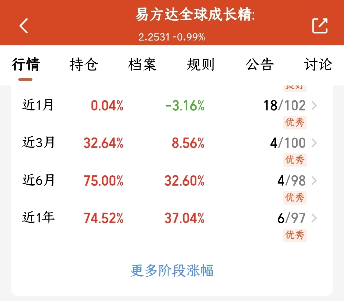 最近股市震荡行情,想要投资更稳健一下,不妨看一下$易方达全球成长精选混合(QDII)人民币C$ ,该基投资全球科技稀缺产品,灵活规避政治风险。基金经理精准预判,调仓灵活,业绩稳健。科技行情长期向好,近期回调是上车良机,全球布局把握成长机遇。