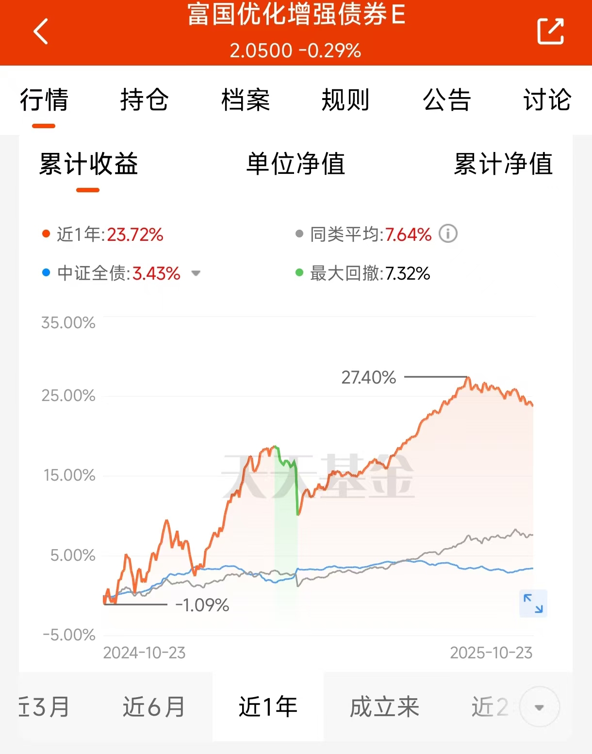 其实现在去买这些,也不一定能稳。说白了现在大盘涨一天跌一天,没有持续性,但是长期又看好,就很矛盾。今天我倒是看到一个$富国优化增强债券E$(018980)挺好的,4债6增强,看二季报持仓增强部分主要做的是创新药和科技,都是大潜力、大预期的行业。要是有机会这种基金不会错过,像近一年就涨了23%,比大部分固收+都强,而且一年最大回撤也就沪深300的一半,整体波动也能控制。#高盛看多A股:慢牛正形成 还有约30%上涨空间#