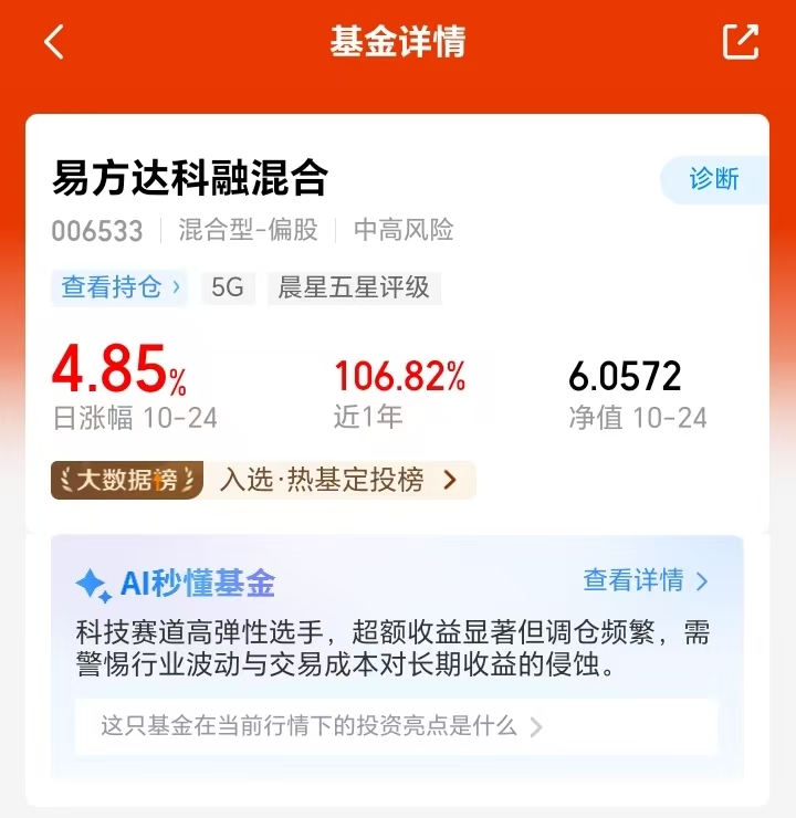今天沪指冲到近十年新高,三大指数集体高开,黄金市场也维持震荡偏强态势,避险需求下有一定支撑。整体看近期股市轮动频繁,之前踩过单一赛道的坑,现在更倾向均衡配置,近期配置了易方达科融混合。它覆盖科技、新能源和军工,能分散风险,回撤控制好、业绩稳,上周五上涨4.85%,近一年涨幅106.82%也不错呢,而且机构持有占比高,打算继续着手布局。