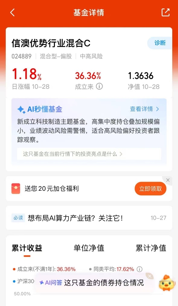 信澳优势行业混合C弹性超高,主要关注AI算力,最近AI火热,可盯紧最热赛道,略微