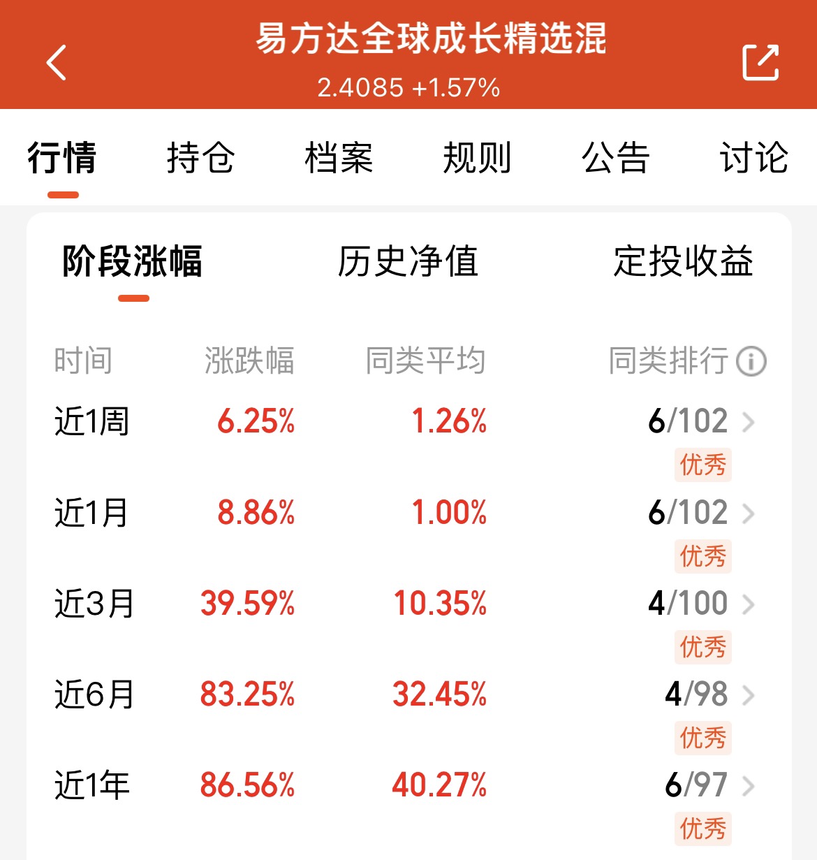 这半年全球科技的成长节奏很清楚,先是美股AI底层技术突破,再是A股搞算力基础设施配套,后来港股互联网也落地了应用。易方达全球成长精选混合C跟得上这个节奏,近半年涨了83.25% ,比同类平均好很多。它会根据不同市场科技板块的阶段调整配置,不踏空也不盲目追高,能帮我精准跟上科技成长的步伐。