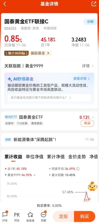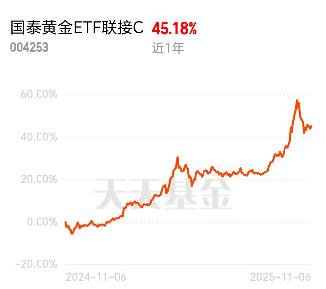 在这样的背景下,我关注了$国泰黄金ETF联接C$ 。这只基金近一年收益45.18%,超过同类平均的36.49%,最大回撤10.45%,表现相当稳健。基金紧密跟踪国内金价,是一只被动跟踪黄金价格的工具型产品,规模大流动性佳,风险收益特征与黄金市场高度联动。