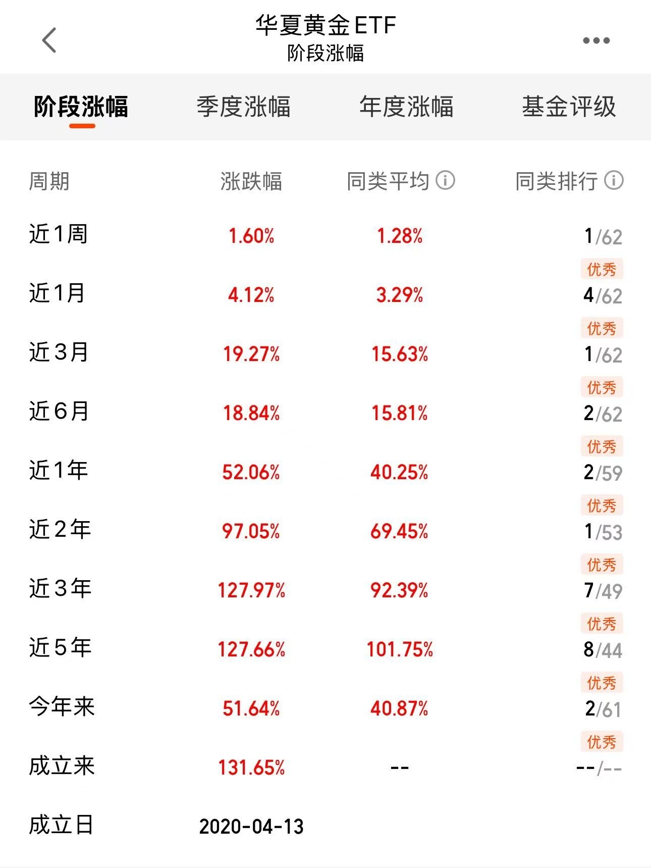 继续看多黄金,这基近一年收益超48%,近3个月收益18.93%,昨天收益1.74%,回撤控制的也好,场内各阶段的业绩基本都是前几名,近期市场震荡,有必要将$华夏黄金ETF联接C$纳入必选仓位了,而且综合费率相较国泰、南方更低,短期业绩却比它们更好,还是不错的