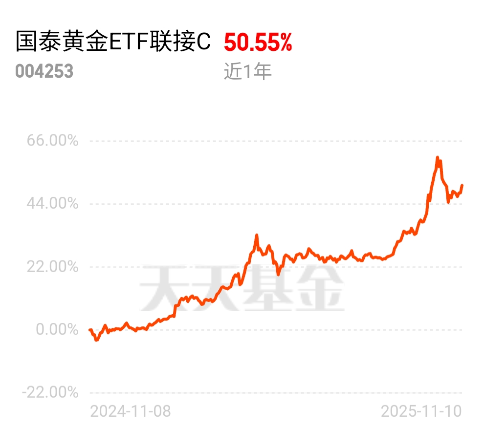 综合来看,黄金凭借其独特的资产属性、多重支撑逻辑和强抗风险能力,在复杂市场环境中展现出不可替代的配置价值。而国$国泰黄金ETF联接A$ $国泰黄金ETF联接C$ 为普通投资者提供了便捷、高效的参与渠道,既规避了直接投资黄金的各类门槛与风险,又能充分享受黄金的配置红利。如今它已成为我组合中的核心防御资产,有它在,面对市场波动时,我的心态也更趋平和稳健。@国泰基金