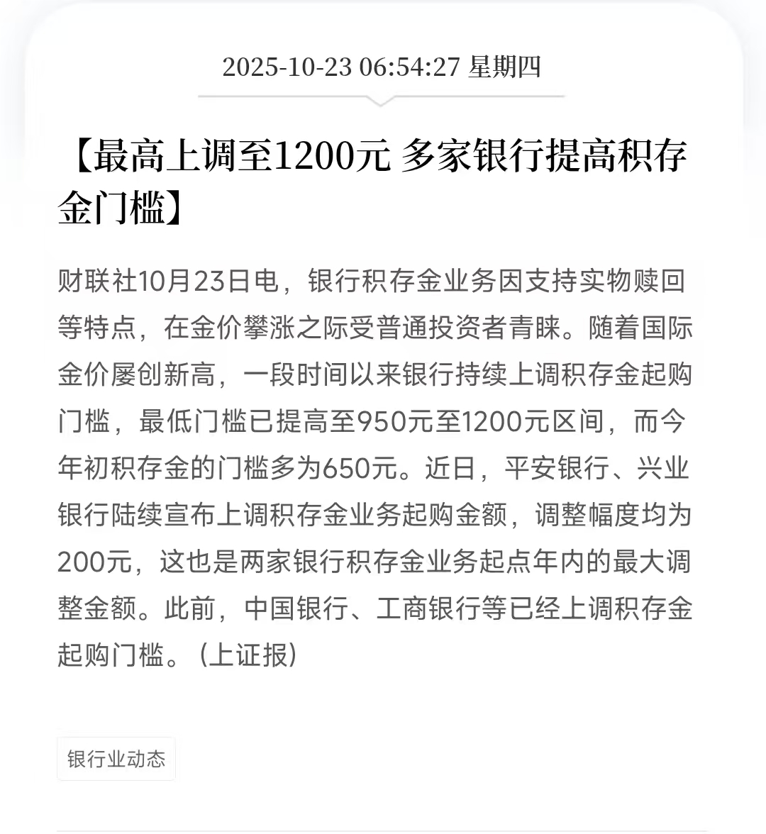 还有另外一件事,多家银行宣布上调积存金起购门槛,俗话说,“低门槛、高流动,高收益,不可能铁三角”,现在提高门槛,类似纳指没额度,同一个思路,找机会继续买