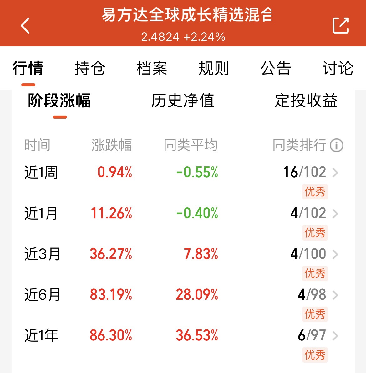 谁懂啊!现在的行情比过山车还刺激,反复横跳真的让人绷不住。不过还好有意外之喜,发现了易方达全球成长精选混合这只稀缺基金,在绩优低回撤榜单上一直稳坐第一。基金经理的调仓能力绝了,全球范围内布局,A股、港股、美股都没落下,尤其是科技方向,每个阶段的风口都能精准把握,涨多跌少的走势太让人放心,不用怕单一市场波动,长期拿着准没错!