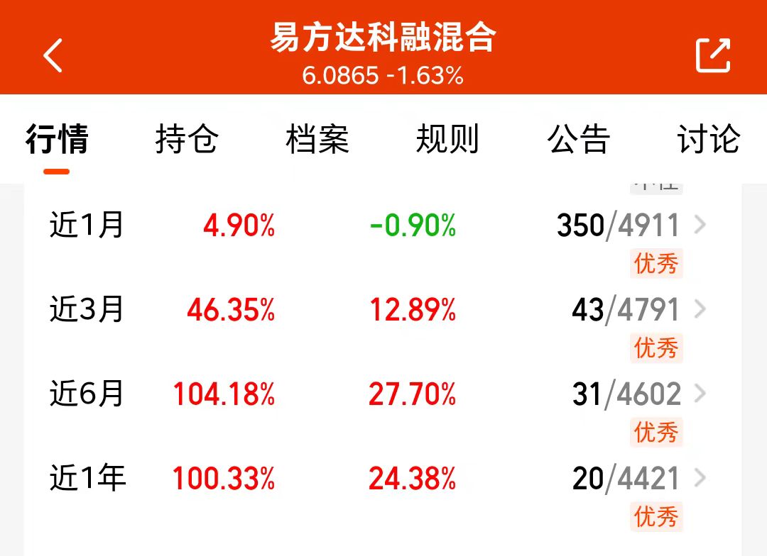 宝子们,沪指涨超4000点后,就开始上上下下波动,我在布局科技主线的同时也兼顾了反内卷政策利好的新能源方向。比如易方达科融混合就是深度参与科技,新能源,军工板块,近半年涨幅已经翻倍了,优秀。
