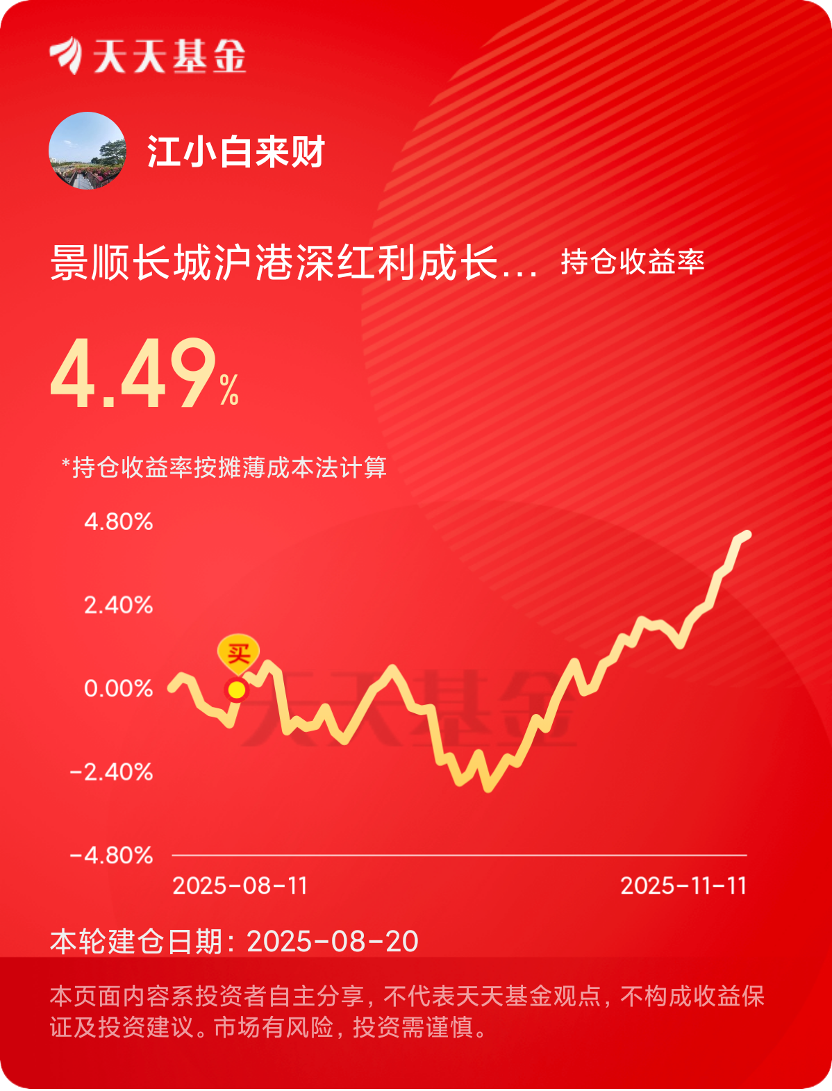 4000点还在震荡,可以配点红利稳住收益,景顺红利就不错,7免指数基,11月以来一直在涨,短期长期投资都合适$景顺长城沪港深红利成长低波指数E$ #晒收益#