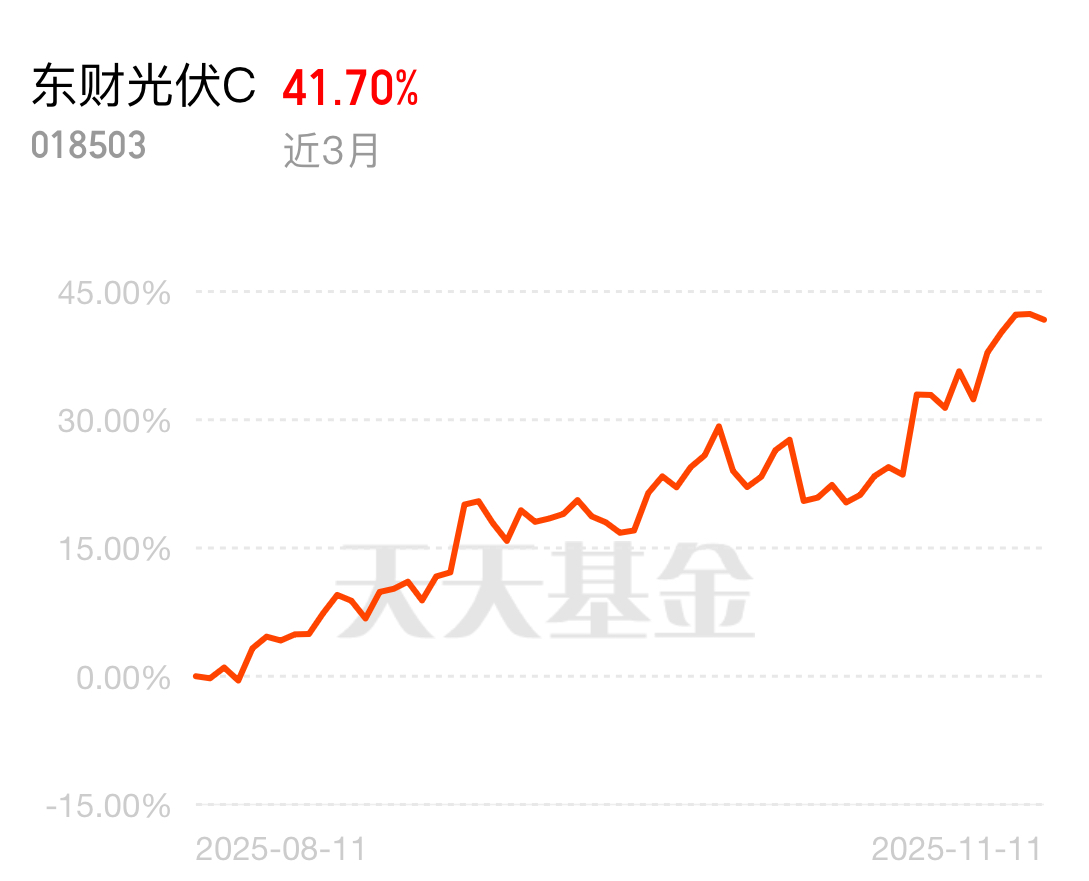 沪指在4000点附近徘徊,不少板块跌得让人没信心,光伏却一路高歌成了领涨先锋。西藏东财中证光伏产业指数C近3个月涨41.70%,出海订单不断反内卷,现在回调给机会,我已经梭哈进场等待牛市接着涨。 $东财瑞利债券C$