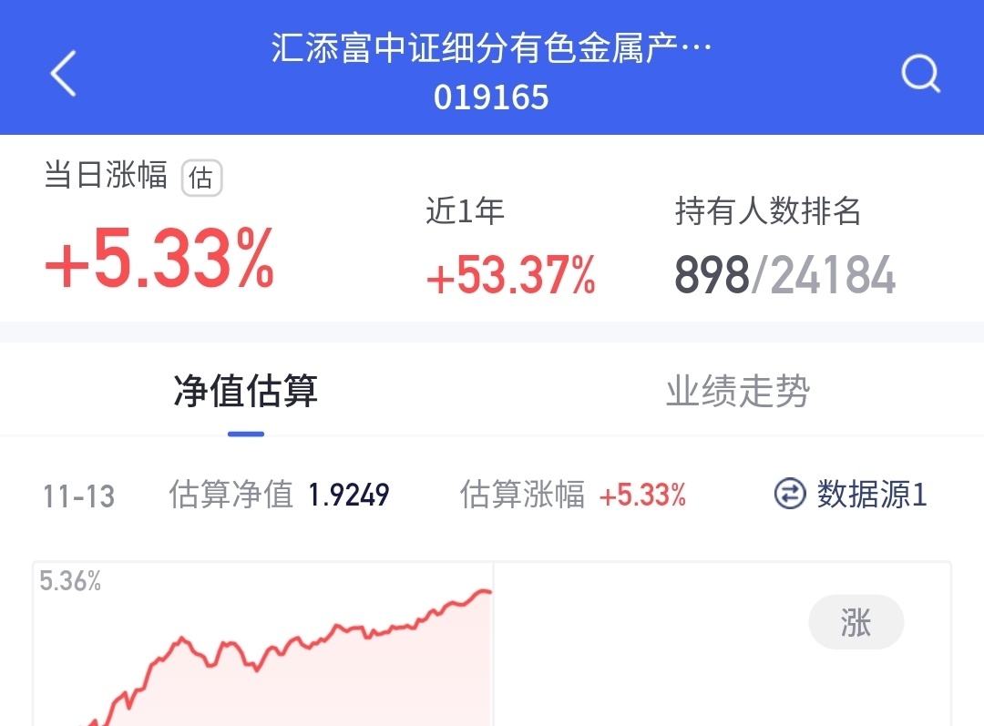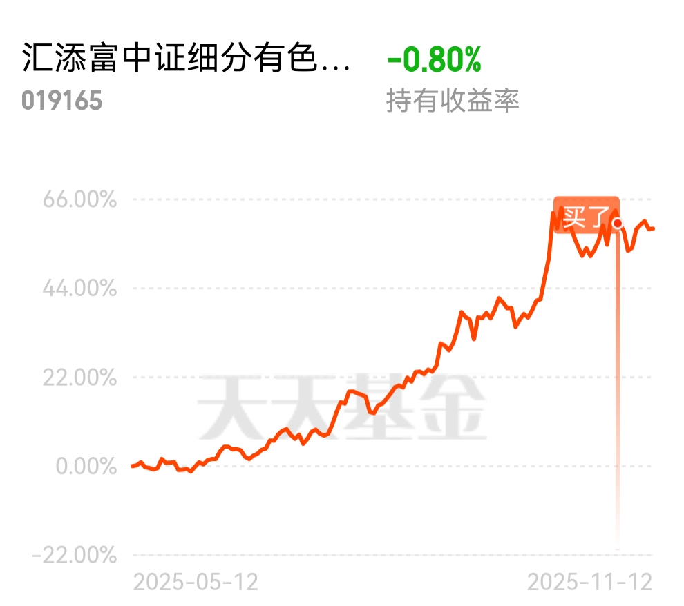 我还是更看好这支$汇添富中证细分有色金属产业主题ETF发起式联接C$ ,跟踪有色金属指数,含铜量30%,黄金含量14%,显著高于同类有色指数,收益弹性也就好一些,近1周涨了3.07%,近半年收益58.76%,已经开始跑赢同类,打出超额收益了;