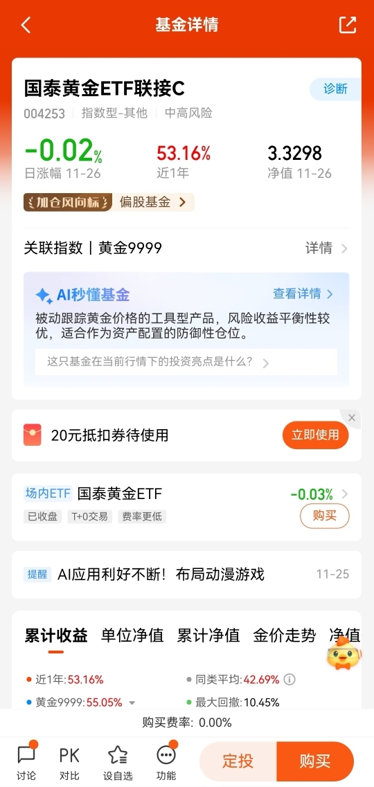 #观点搭子团火热招募中!# $国泰黄金ETF联接C$ 11月26日收-0.02%。近期美联储12月有关降息概率时增时减,有些反复,而COMEX黄金在达到前高4200点左右的位置时也出现了前高逼停上涨的情况,那么这个是否可以认为是当前黄金市场的一个窄幅震荡区间,我们将时间线拉回到3400点的位置看,也有这样的震荡空间,那么这是否也能给我们带来一些投资参考,在这样的区间进行波段操作,好像也很不错,如果本次不能有效突破前高,加上美联储议息会议存在的不确定性,那么后续将会迎来一定幅度的调整,先出后进,扩大收益,国泰黄金ETF联接C买入持有7~30天赎回费仅为0.1%,几乎可以认为是7免黄金基了,这不就是我们很好的进行黄金波段增益的好帮手吗,当然了,进行长期定投也是相当不错的!@国泰基金