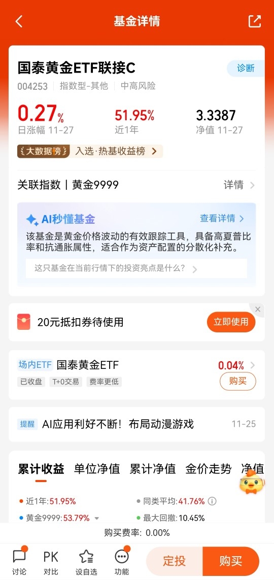 #观点搭子团火热招募中!# $国泰黄金ETF联接C$ 11月27日收+0.27%。COMEX黄金在4200点的位置进攻无力,倘若继续横盘,后续大概率会进行回调,那么在去美元化+各国央行持续购金行为+美联储降息预期提升等因素的影响下,中长期黄金都会有继续上行的趋势,如若接下来会迎来回撤,那我们就可以观望在3800-3900的位置的止跌信号,进行下一步加仓/建仓操作,享受又一轮黄金波段收益,在波段操作上,国泰黄金ETF联接C还是很合适的,持有满7-30天,赎回费率仅0.10%,也就是相当于7免黄金基,加上本身的费率比较低廉,不论是短期投资做波段,还是长期布局,都是优选!@国泰基金