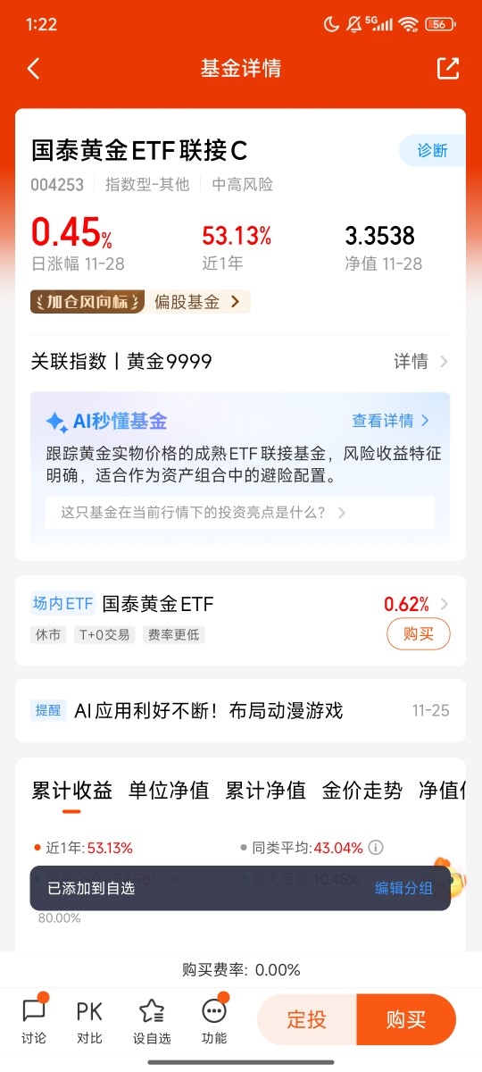我看$国泰黄金ETF联接C$,特别是在不确定性增加的市场环境中,黄金基金为我提供