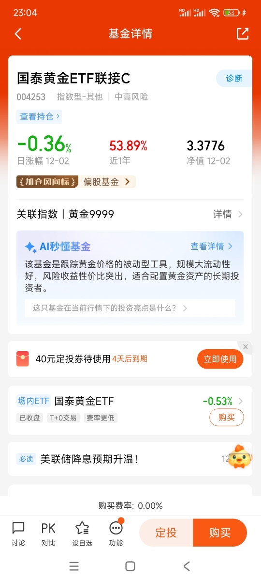 12月2日,第二天打卡发帖,今日$国泰黄金ETF联接C$跌0.36%,可能有人要