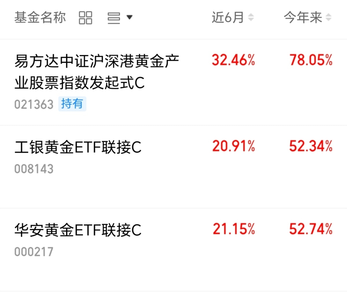 今日市场延续上涨趋势,有色金属板块也表现出色,同时黄金股还能在黄金的基础上,加上杠杆和久期,所以比起黄金ETF联接更有弹性,并且还可享受到有色金属大行情的趋势,其中我持有的$易方达中证沪深港黄金产业股票指数发起式C$ 自今年以来涨幅高达78.05%,远超同类黄金股指数,各阶段的业绩都排名优秀,我也长期拿住了!