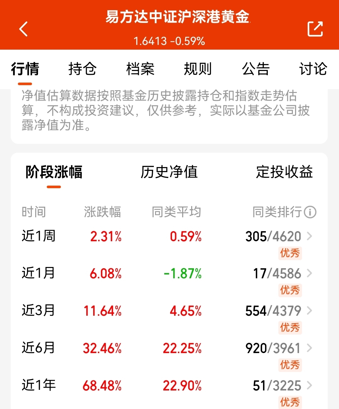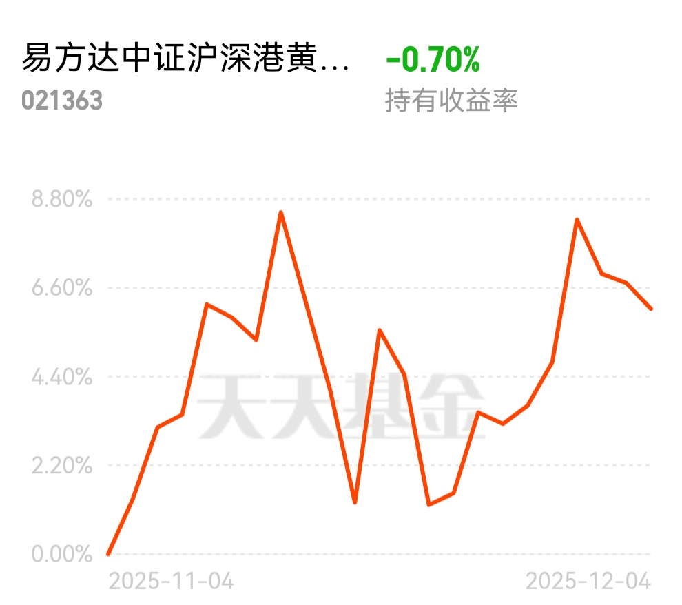 尤其是这支$易方达中证沪深港黄金产业股票指数发起式C$ ,跟踪黄金板块,今天估值又涨2.4%,近3个月涨了11.64%,近1年收益68.48%,长期看,也是答复跑赢同类啦,有一定超额,年底资金防守情绪下,我觉得黄金行情还能延续;