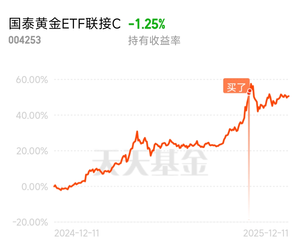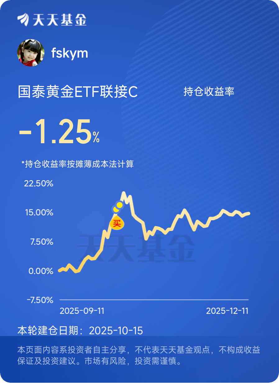 12月11日,第十一天打卡发帖,今日$国泰黄金ETF联接C$ 涨0.16%,其实今日小涨一点都不意外,最近黄金市场的大环境本来就很给力。前一天美联储刚宣布今年第三次降息,把利率下调了25个基点,这种宽松政策一出来,美元走弱,黄金作为避险资产的吸引力自然就上去了 。而且现在全球还有不少地区冲突没平息,加上各国央行还在持续买黄金,今年以来购金总量都超1000吨了,这些都在给金价托底 。看看国际市场,伦敦现货黄金都涨到4238美元/盎司了,国内金店价格也跟着涨,黄金ETF跟着沾光也顺理成章。@国泰基金 #晒收益#