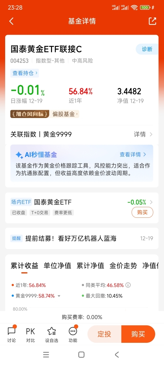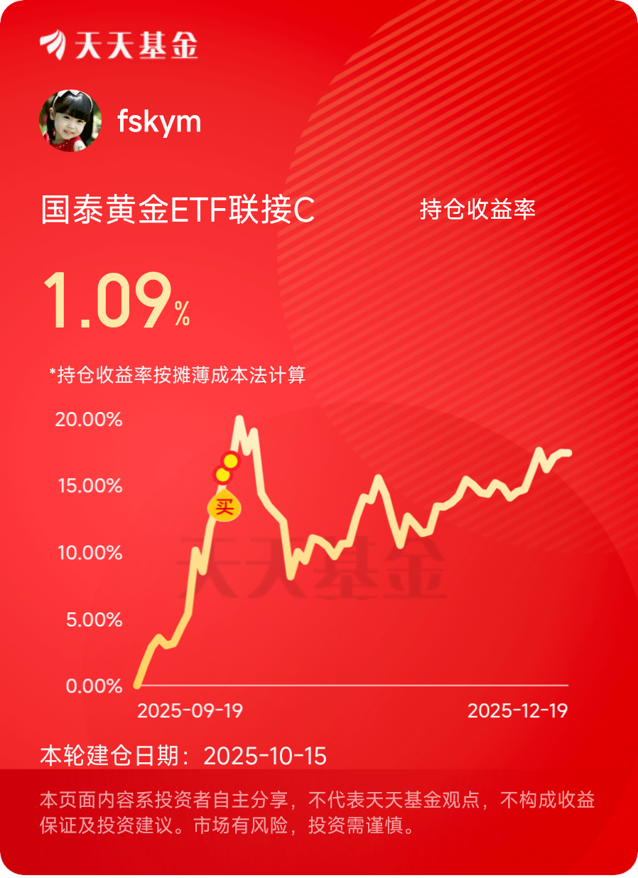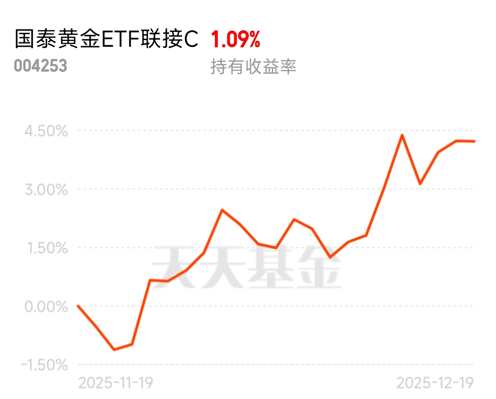 12月19日,第十九天打卡发帖,今天$国泰黄金ETF联接C$跌0.01%,最近关