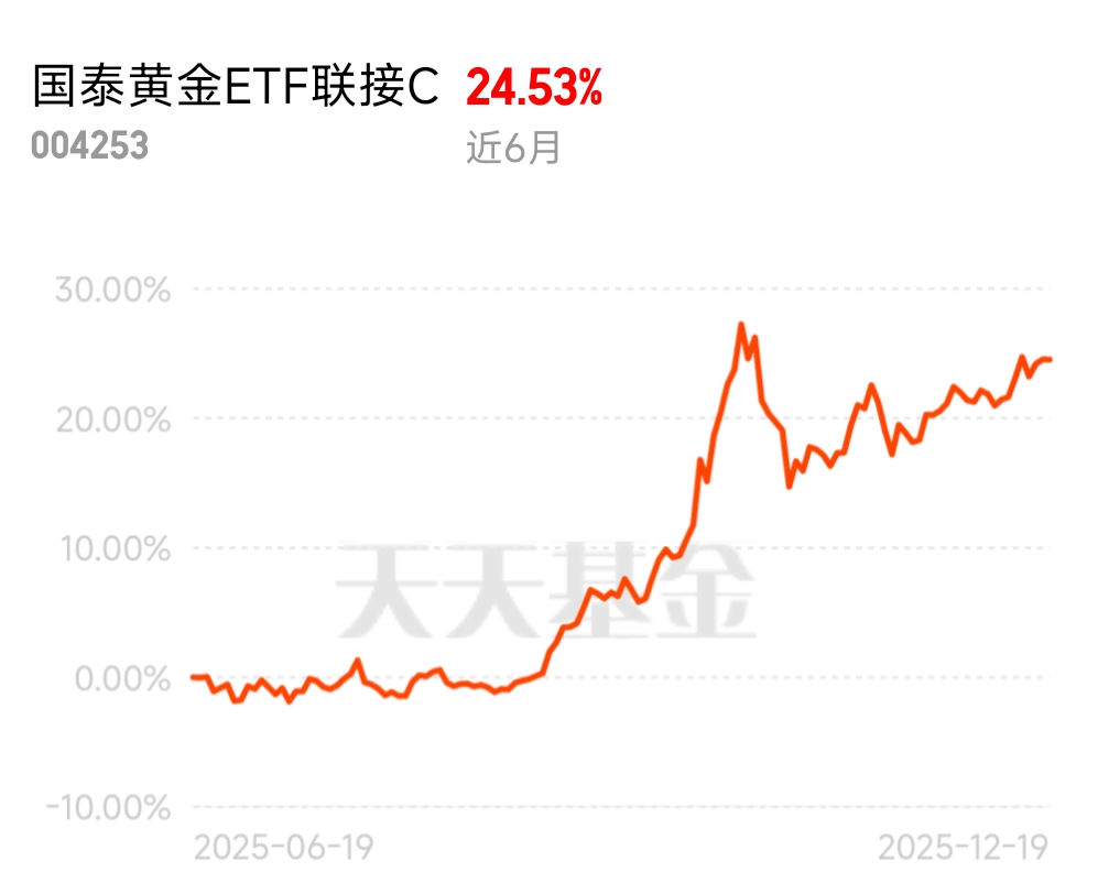 2025年$国泰黄金ETF联接C$ 交出了一份炸裂成绩单,全年累计涨了56.76%,12月19日伦敦现货金都飙到4337.70美元/盎司了,要是从2023年初算到现在,涨幅更是夸张到135%,当初入手黄金的人,现在怕是偷着乐呢。