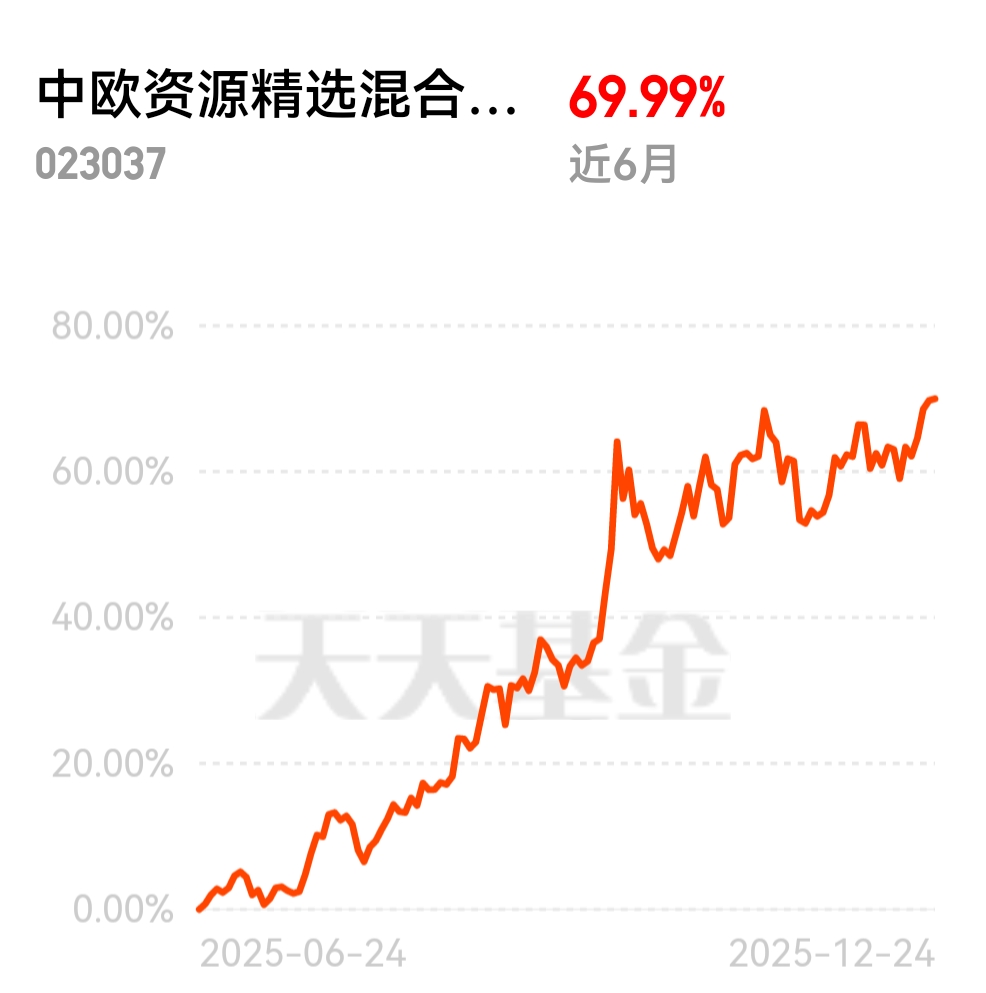 美元指数走弱,流动性环境变向好,资源品行情有支撑,中欧资源精选混合发起 C 近 6 月 69.99%,主动基金业绩领先,短期能蹭资源板块热度,长期靠政策 + 供需双驱动。$中欧资源精选混合发起C$