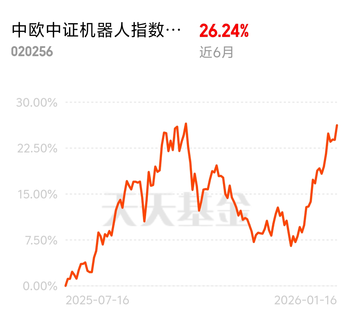 机器人板块今天又迎来爆发,已经成当前市场实打实的热点,资金关注度越来越高。中欧中证机器人指数发起 C 聚焦细分领域龙头,行业代表性比泛科技基金强,近 6 月涨 26.24%,政策和产业都给劲,当下配置正合适,不用犹豫。$中欧中证机器人指数发起C$