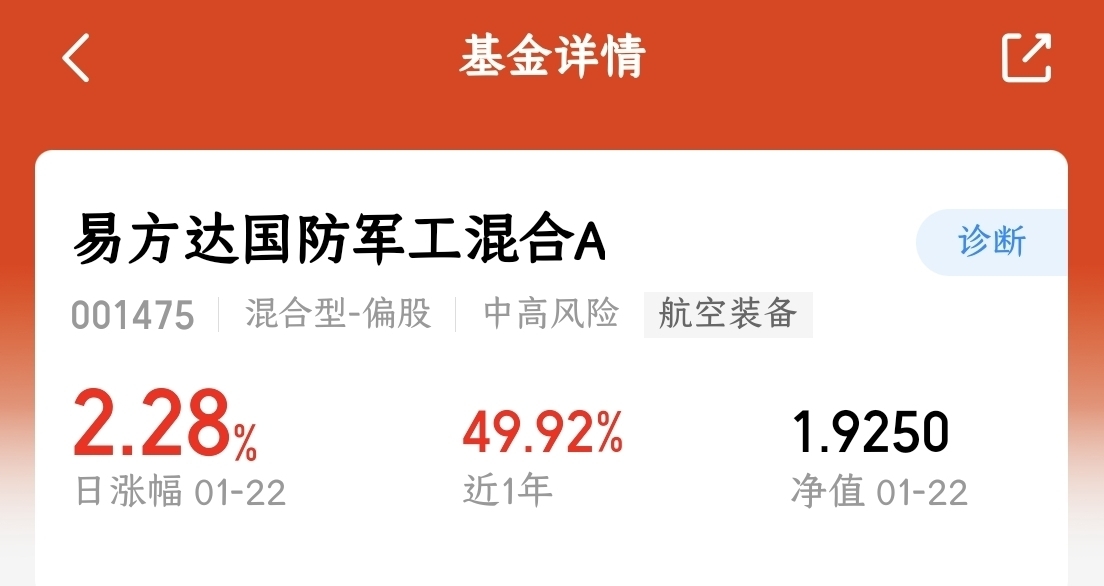最近股市行情不错,今天在商业航天的带领下,国防军工板块也是大涨。易方达国防军工混合A昨日上涨2.28%,今天估值又三个多点,厉害了。而且该基近一年涨幅49.92%,也是很不错的!