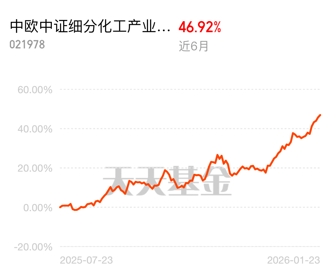 化工行业这下迎来真风口了,七部门出了石化化工稳增长方案,2025-2026 年年均增长 5% 以上,有保有压调供需,有机硅限产反内卷供需变好,2026 年缺口还会扩,中欧中证细分化工产业主题指数发起 C 近 6 月涨了 46.92%,政策加周期反转拐点到了$中欧中证细分化工产业主题指数发起C$