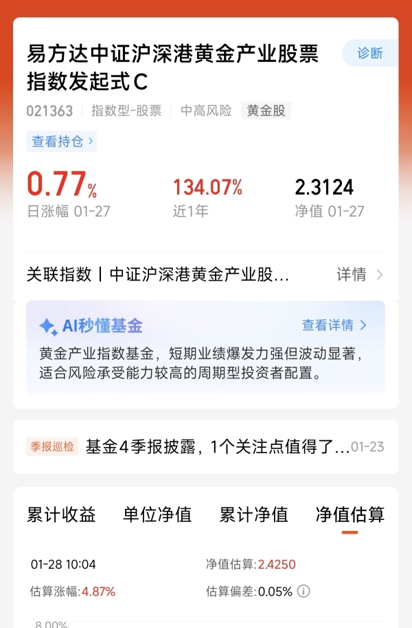 强者恒强。今天的黄金再度创出了新高。目前全球不确定性依然还在。避险情绪也是持续增长。资金加速流入了黄金。今天的黄金产业再度迎来了爆发。易方达黄金产业股票覆盖沪港深黄金产业龙头。昨天上涨了0.77%,今天估值再度突破5个点。爆发力的表现好。黄金股作为黄金的放大器,每次爆发起来弹性大。我看好今年的稳定收益表现。