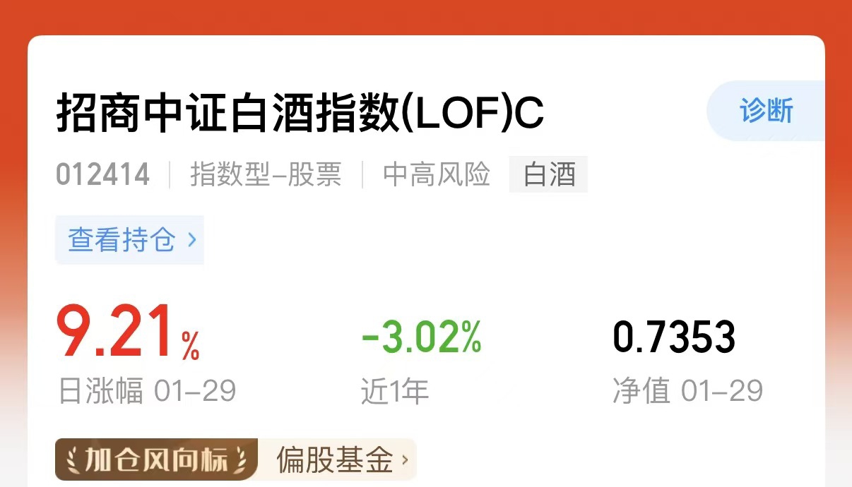 白酒昨天给了一个最大的惊喜,这个基金曾经是A股的核心资产,跌了几年后的板块,昨天突然爆发$招商中证白酒指数(LOF)C$ 昨天上涨超9个点,持仓的都是茅台,五粮液等一些龙头的酒体。头部酒企有分红回顾,ETF资金托底,后面有望加速筑底,继续看好。