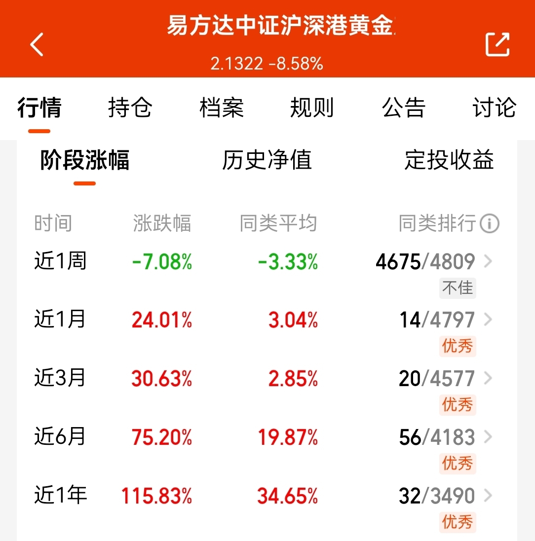 这支$易方达中证沪深港黄金产业股票指数发起式C$ 今天也整体反弹,跟踪黄金板块,近1年也大涨了115.83%了,短期赚钱效应确实很强咯;